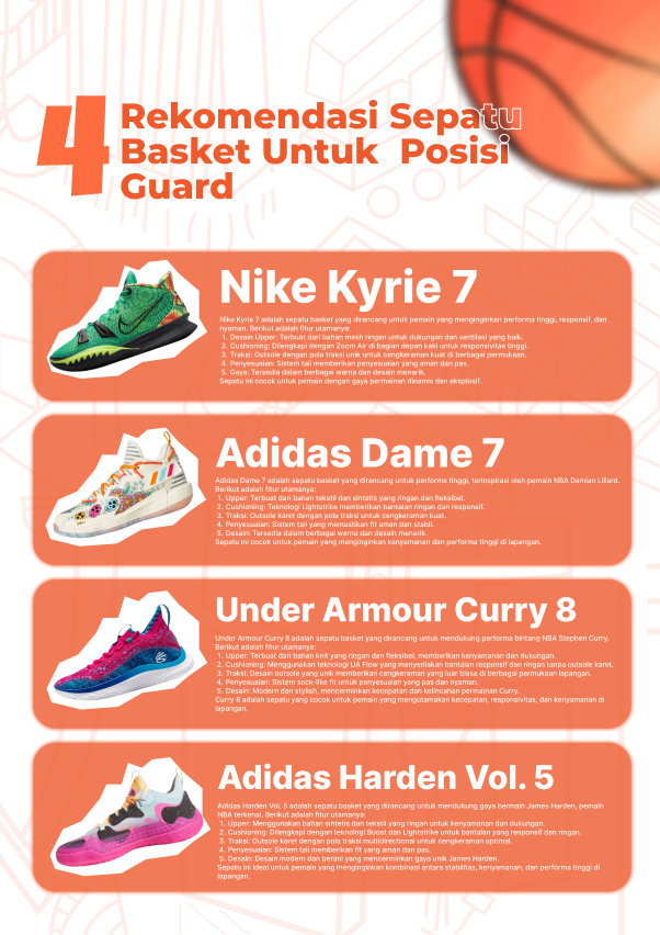 Tinggalkan Komentar / Oleh Danpras / 26 Agustus 2024 infographics This is a multimedia project that is making infographics about anything. And here I am making infographics about 4 recommendations for basketball shoes that are suitable for the guard position, I made this with figma software.