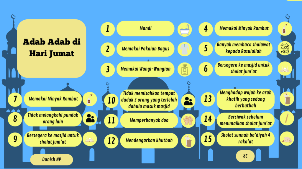 Hari Jumat adalah hari yang mulia, dan kaum muslimin di seluruh penjuru dunia memuliakannya. Keutamaan yang besar tersebut menuntut umat Islam untuk mempelajari petunjuk Rasulullah dan sahabatnya, bagaimana seharusnya menyambut hari tersebut agar amal kita tidak sia-sia dan mendapatkan pahala dari Allah ta’ala. Berikut ini beberapa adab pada hari Jumat yang harus diperhatikan bagi setiap muslim yang ingin menghidupkan syariat Nabi shallallahu ‘alaihi wa sallam