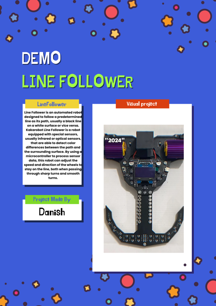 Line Follower is an automated robot designed to follow a predetermined line as its path, usually a black line on a white surface or vice versa. Kakarobot Line Follower is a robot equipped with special sensors, usually infrared or optical sensors, that are able to detect color differences between the path and the surrounding surface. By using a microcontroller to process sensor data, this robot can adjust the speed and direction of the wheels to stay on the line, both when passing through sharp turns and smooth turns.