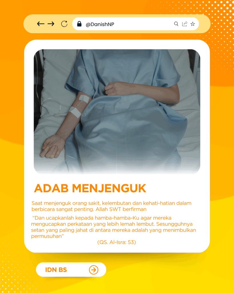 Assalamualikum Warahmatullahi wabaraktuh, This is my first project ini dinyah, that is making poster adab menjenguk orang sakit. So i made this in canva. in this poster i put the dalil from surah Al Isra Verse 53, That tell the atitude of visiting sick people.