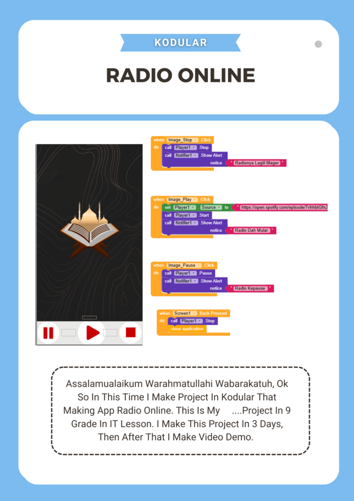 IT_9_Kodular_RadioOnline Tinggalkan Komentar / Oleh Danpras / 28 Agustus 2025 Radio Online Assalamualaikum Warahmatullahi Wabarakatuh, Ok So In This Time I Make Project In Kodular That Making App Radio Online. This Is My ….Project In 9 Grade In IT Lesson. I Make This Project In 3 Days, Then After That I Make Video Demo.