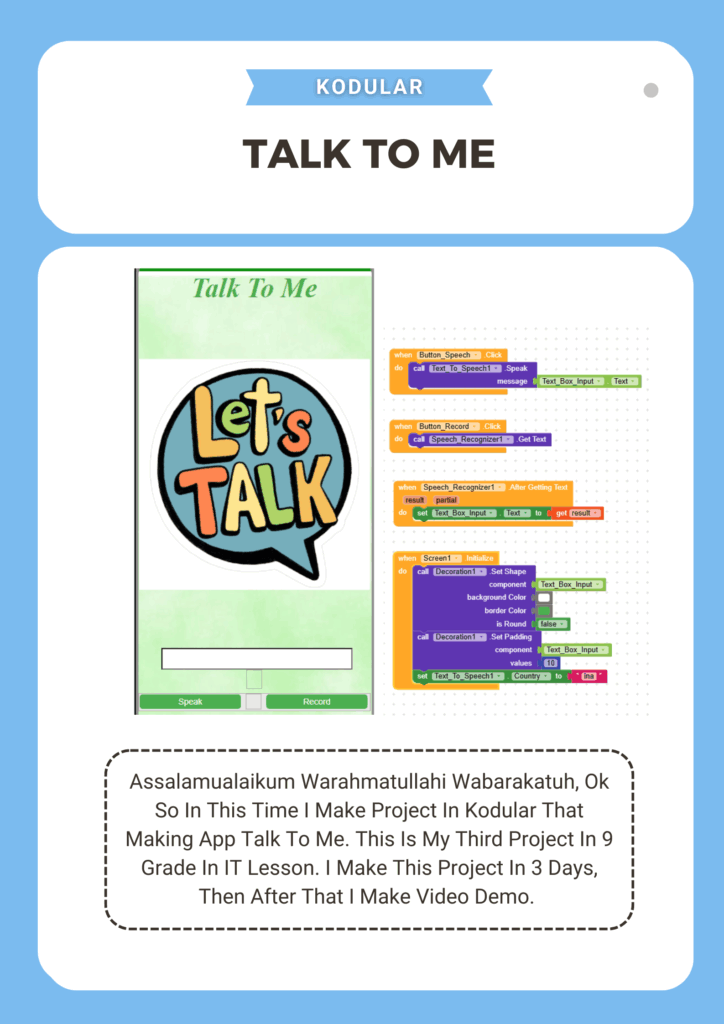 Tinggalkan Komentar / Oleh Danpras / 29 Agustus 2025 Talk To Me Assalamualaikum Warahmatullahi Wabarakatuh, Ok So In This Time I Make Project In Kodular That Making App Talk To Me. This Is My Third Project In 9 Grade In IT Lesson. I Make This Project In 3 Days, Then After That I Make Video Demo.