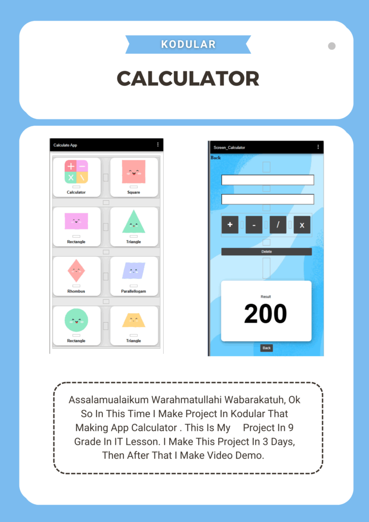 IT_9_Kodular_Calculator Tinggalkan Komentar / Oleh Danpras / 5 September 2025 Calculator Assalamualaikum Warahmatullahi Wabarakatuh. Okay, so this time I made a project in Kodular — a Calculator App. This is my project for 9th grade IT class. I finished this project in 3 days. After that, I made a demo video to show how it works.
